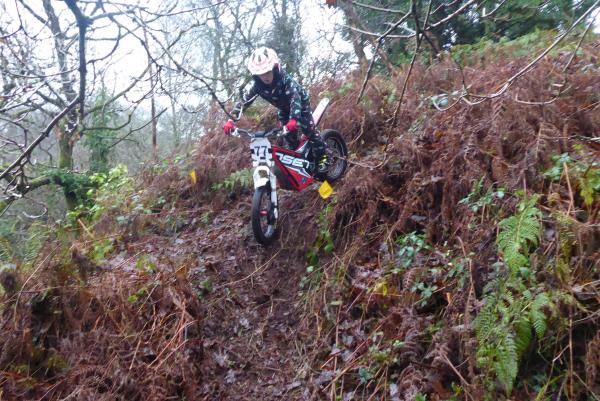 The Camborne and Redruth MC held the final round of the 2022 Cornwall OSET Cup Summer/Autumn series at Garker Woods, St Austell on Tuesday 27th December. Winter flu' symptoms had hit many adults and young riders reducing the entry to just 25 who braved three laps of eight sections in torrential rain all day. Many parts of the venue were flooded, and organisers had to quickly cut through another access into the woods as the main area was impassable due to flooding. Sections all proved difficult and time consuming with the Hard Course riders finishing in almost darkness however it was good to see several now move up onto the Hard Course. The OSET rider of the day was 7-year-old Riley Wales on the Medium Course who had a brilliant ride in difficult conditions to lose just 8 marks over the three laps.