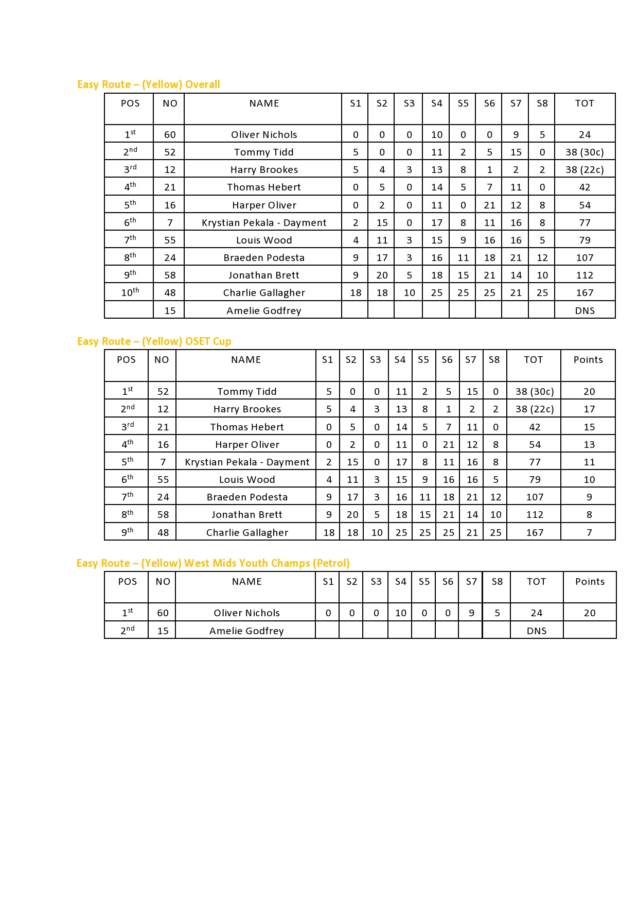 The yellow route also had one petrol rider, and another new rider with us. Oliver Nichols took the overall win with 24 dropped. On the OSET cup route, Tommy Tidd’s first ride with DYTC saw him just take the win on most cleans from Harry Brookes. Both boys I believe are the same age and tied on 38 marks, so they had to work for it! Thomas Herbert was only 4 points back and finished 3rd overall. Harper Oliver is really pushing on now after her 3rd place in our winter series. Harper securing a solid 4th place on the day behind the boys. Krystian Pekala – Dayment was 5th, having to bike share with older sister Kasia. Louis Wood had his Dad Les’s full attention with Josh unable to ride due to his unfortunate accident mentioned above. I saw Louis myself 4 or 5 times and his improvement is massive in a short space of time. Once Louis has ironed a couple of mistakes out he will be pushing the top 3 of the class I think. Braeden Podesta was next, and like Louis will soon be up there. Braeden and his Dad Martin always look to be having an awesome day out as a team. Local lad Jonathan Brett made a return with us on his OSET 24 and gained confidence throughout the trial.